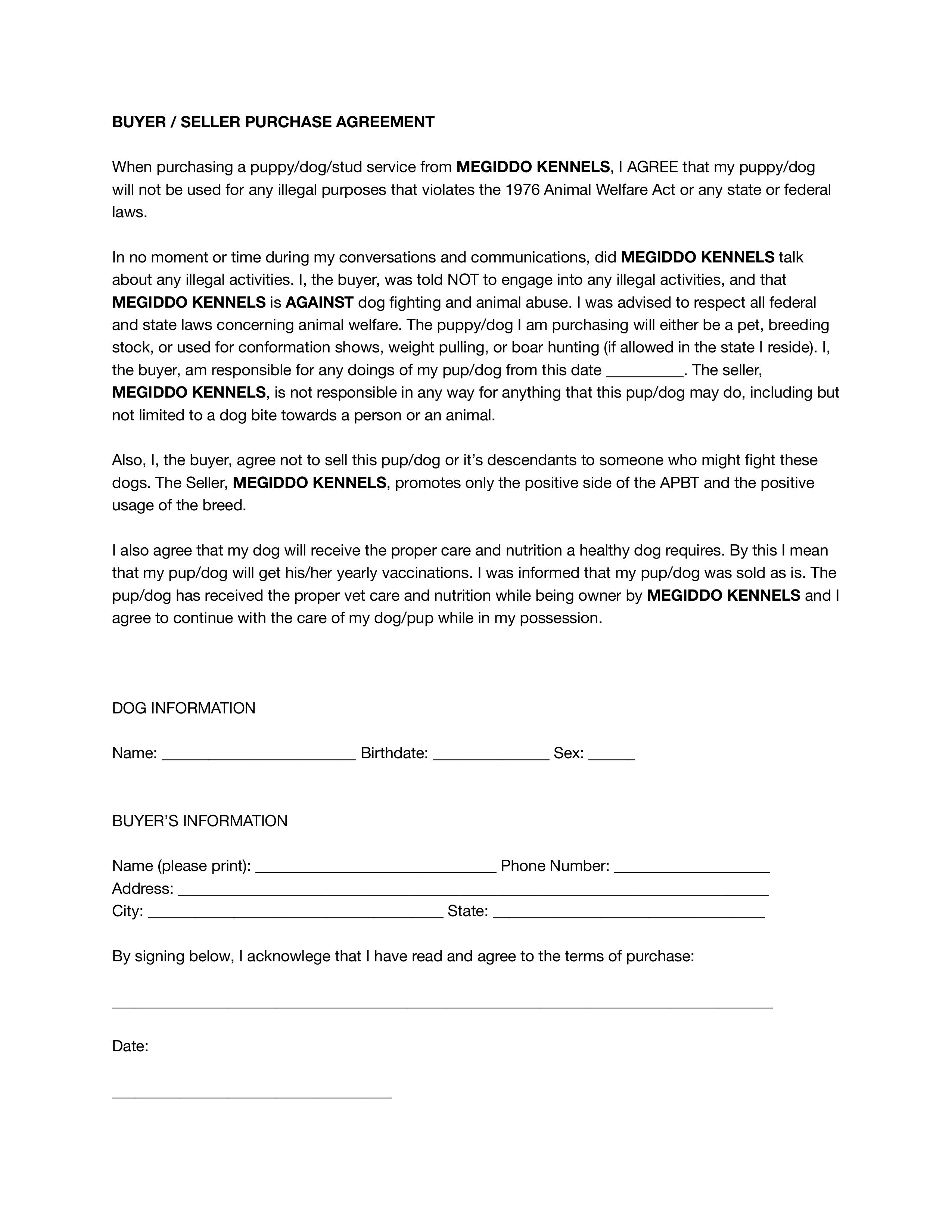 Please review our buyer-seller agreement before purchasing. This document will be signed at the time of purchase to ensure both parties understand and agree to the terms.
